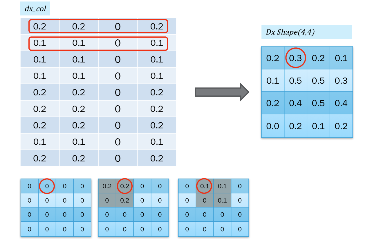 我们还需要将 $\mathrm{d} {X_{col}}$ 再转回二维矩阵的形式,也就是 col2im: