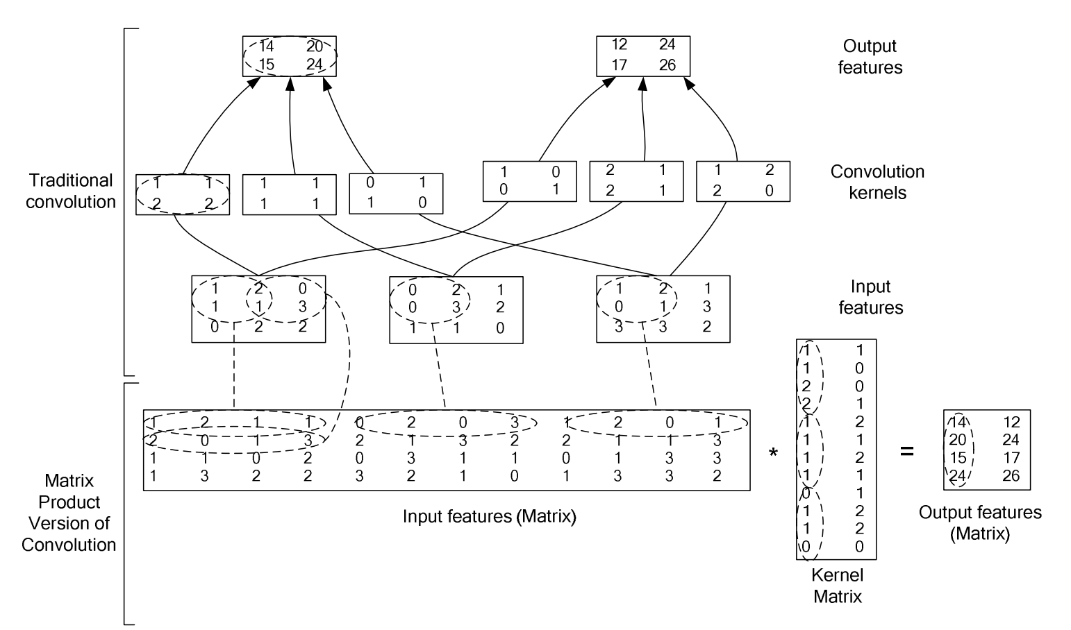 \[ \begin{align} X \otimes W = X_{col} \, W_{col} & = \begin{pmatrix} x_{11} & x_{12} & x_{21} & x_{22} \\ x_{12} & x_{13} & x_{22} & x_{23} \\ x_{21} & x_{22} & x_{31} & x_{32} \\ x_{22} & x_{23} & x_{32} & x_{33} \end{pmatrix} \begin{pmatrix} w_{11} \\ w_{12} \\ w_{21} \\ w_{22} \end{pmatrix} \\ & = \begin{pmatrix} x_{11} w_{11} + x_{12} w_{12} + x_{21} w_{21} + x_{22} w_{22} \\ x_{12} w_{11} + x_{13} w_{12} + x_{22} w_{21} + x_{23} w_{22} \\ x_{21} w_{11} + x_{22} w_{12} + x_{31} w_{21} + x_{32} w_{22} \\ x_{22} w_{11} + x_{23} w_{12} + x_{32} w_{21} + x_{33} w_{22} \\ \end{pmatrix} = \boldsymbol{Y}_{col} \end{align} \]