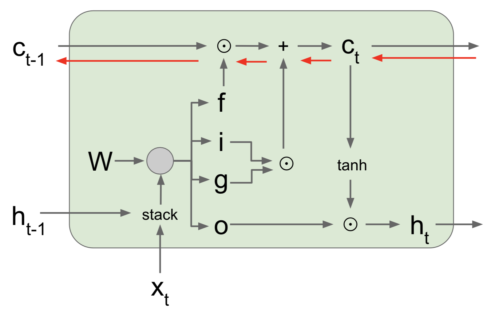 dx, dWx, dWh, db, dprev_h 和 dprev_c 的梯度。弄清楚哪些变量之间有关联,然后利用链式法则即可: